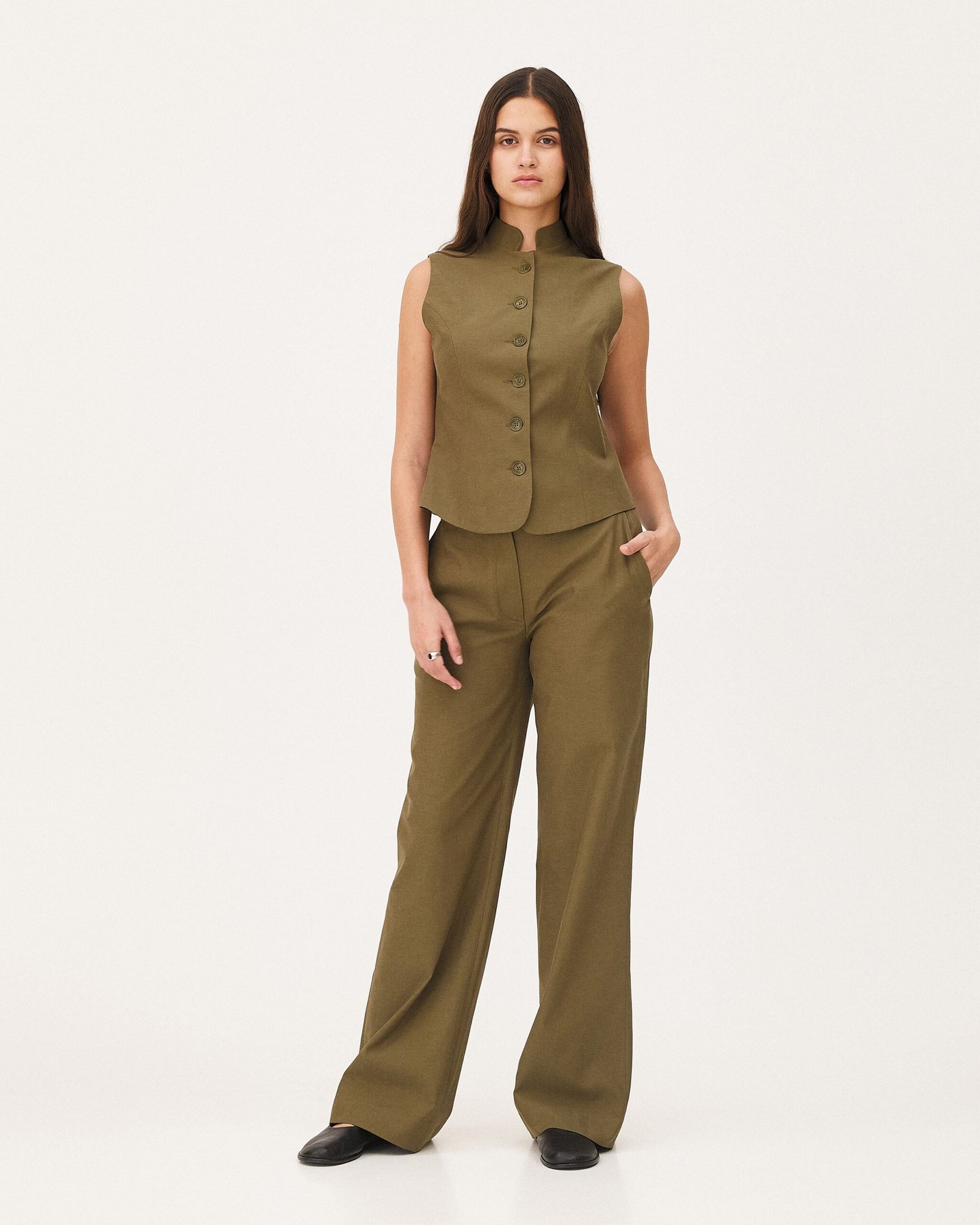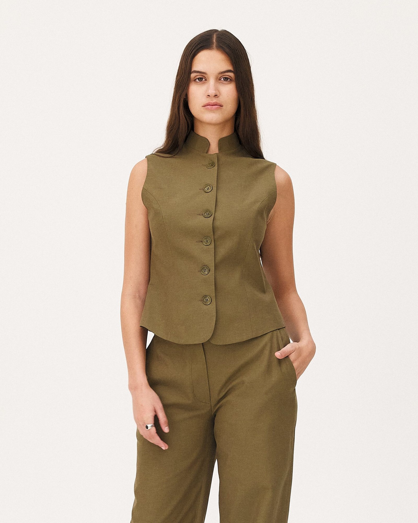 Il gilet Agar è confezionato come un abito. Le pinces seguono le curve del corpo, conferendo struttura ed eleganza. È realizzato in twill fluido di lyocell e cotone organico.