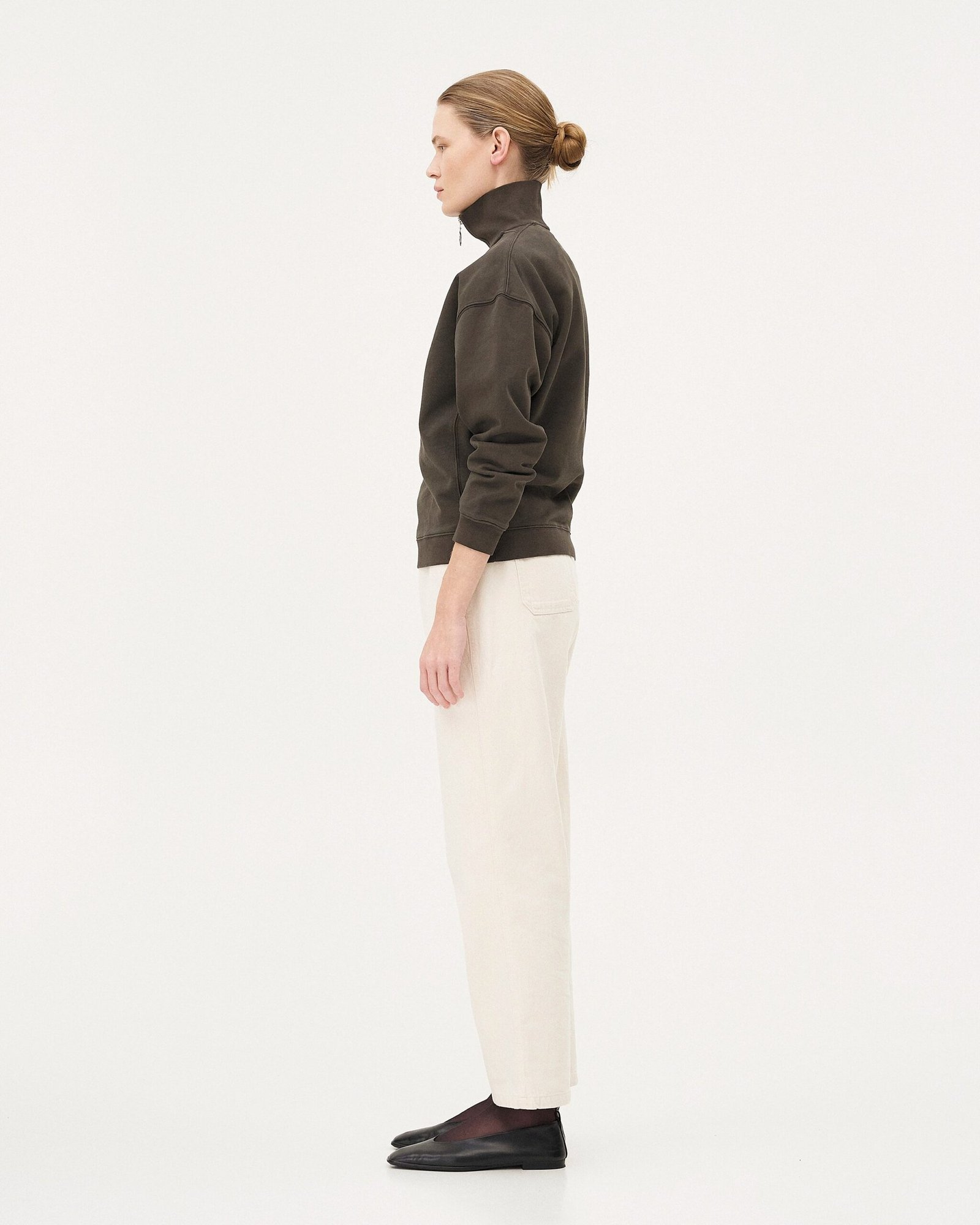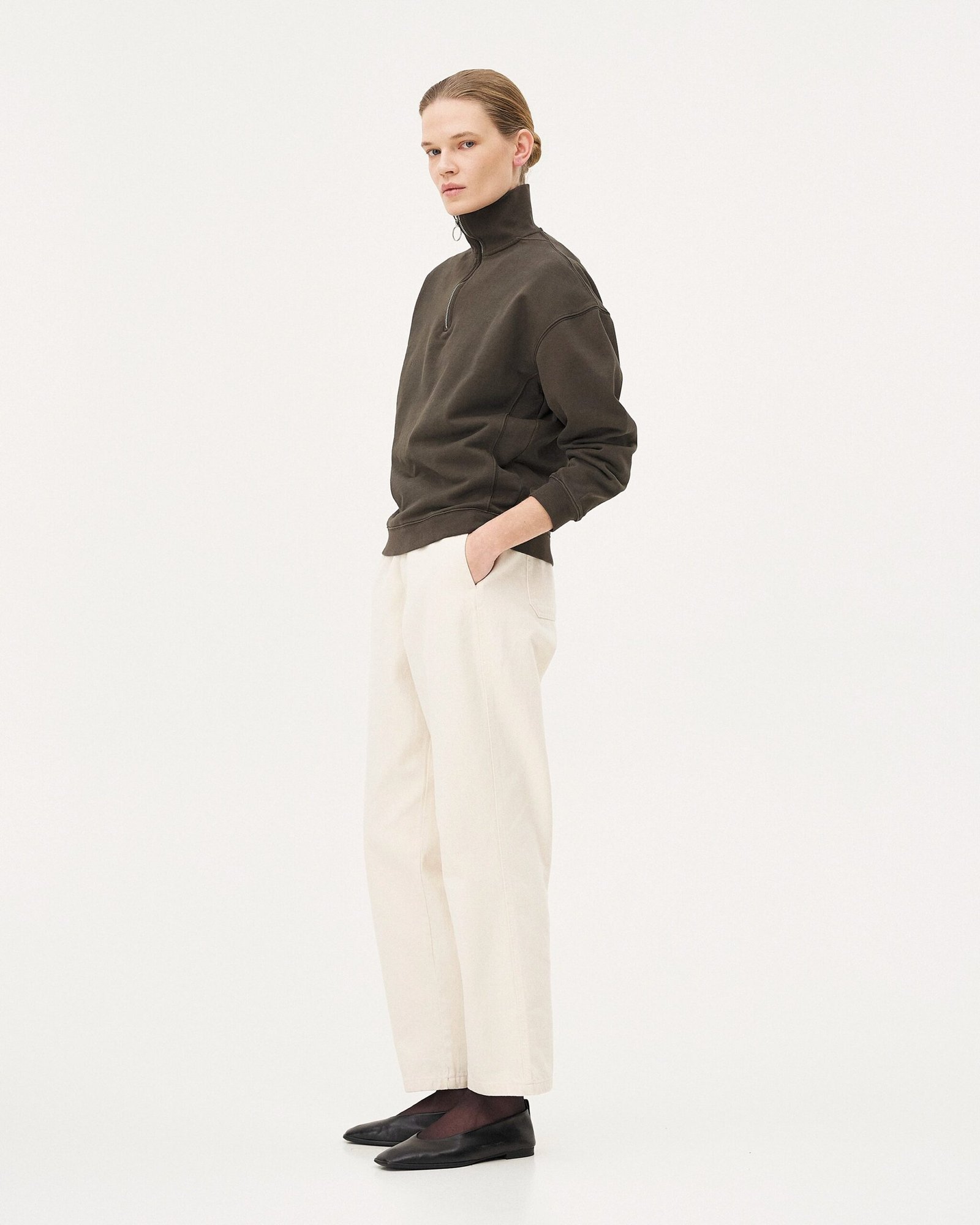 Progettati per durare nel tempo, questi jeans unisex sono diventati una parte iconica del nostro guardaroba. Sono realizzati in un tessuto tessuto con fibre di cotone biologico in Italia. La trama twill conferisce loro resistenza e flessibilità. Hanno una vestibilità ampia, con gambe dritte e leggermente affusolate sul fondo. Il cavallo lungo e l’elastico in vita consentono di indossare i pantaloni a vita alta o normale.