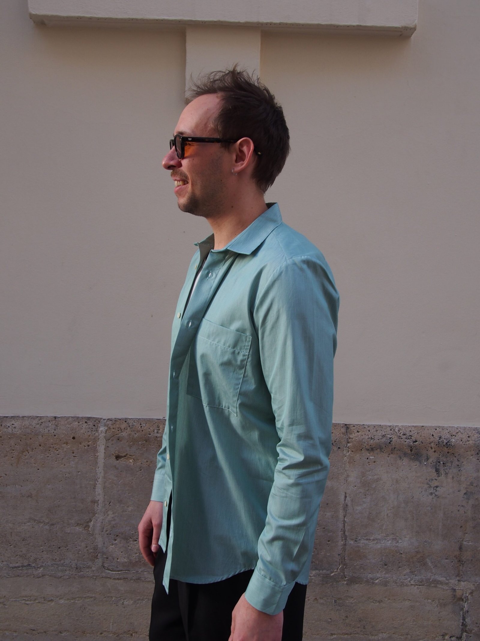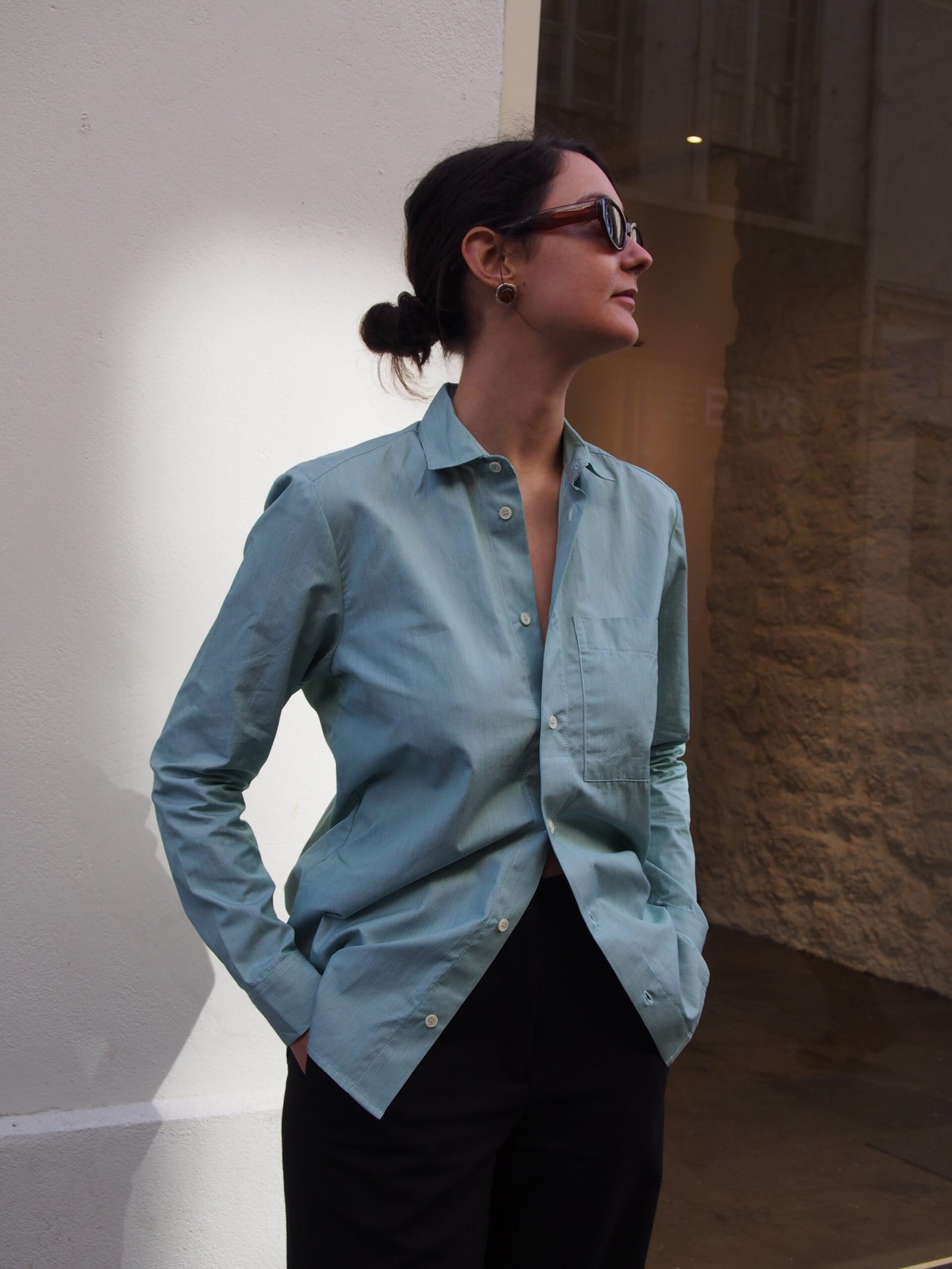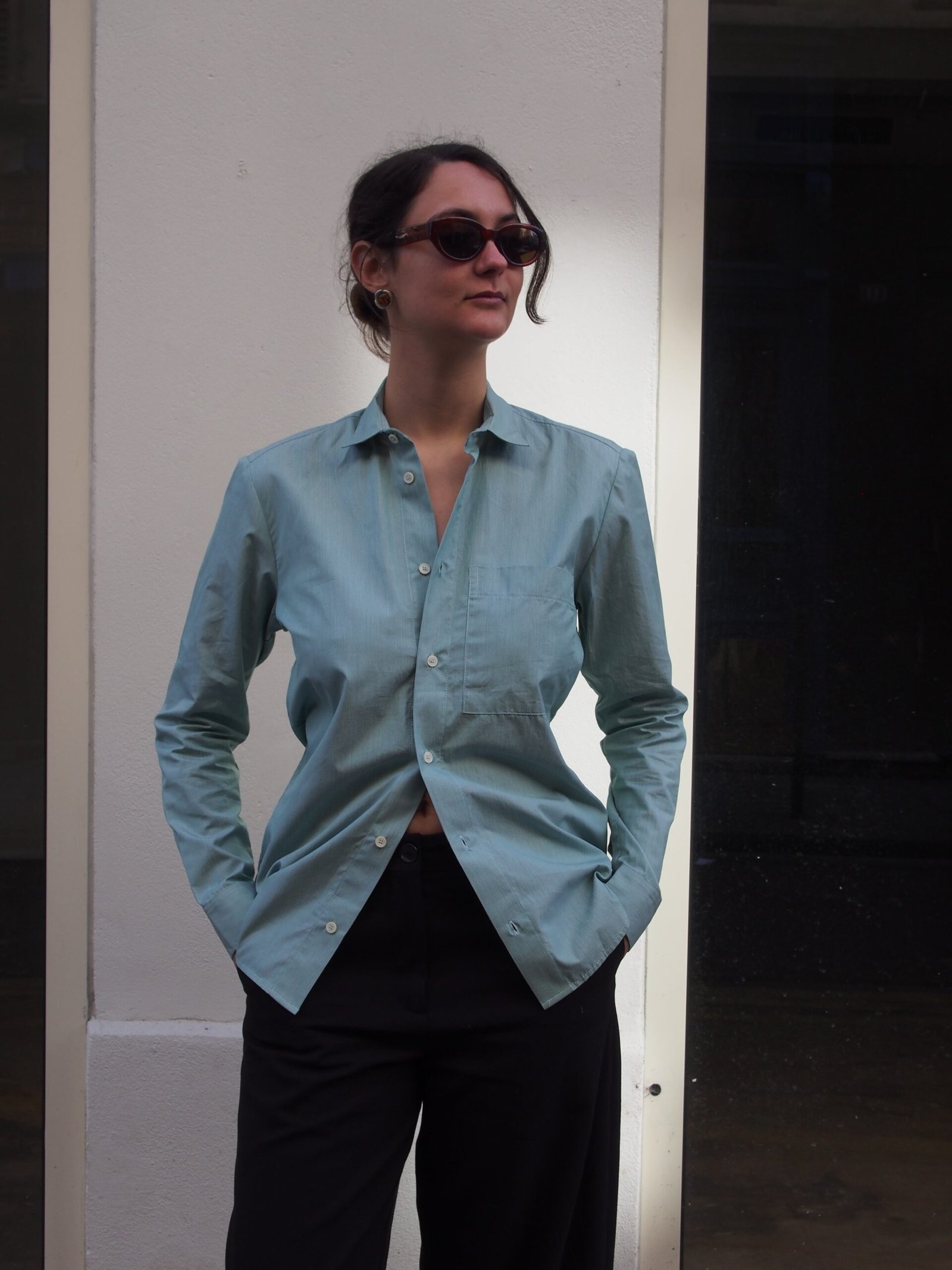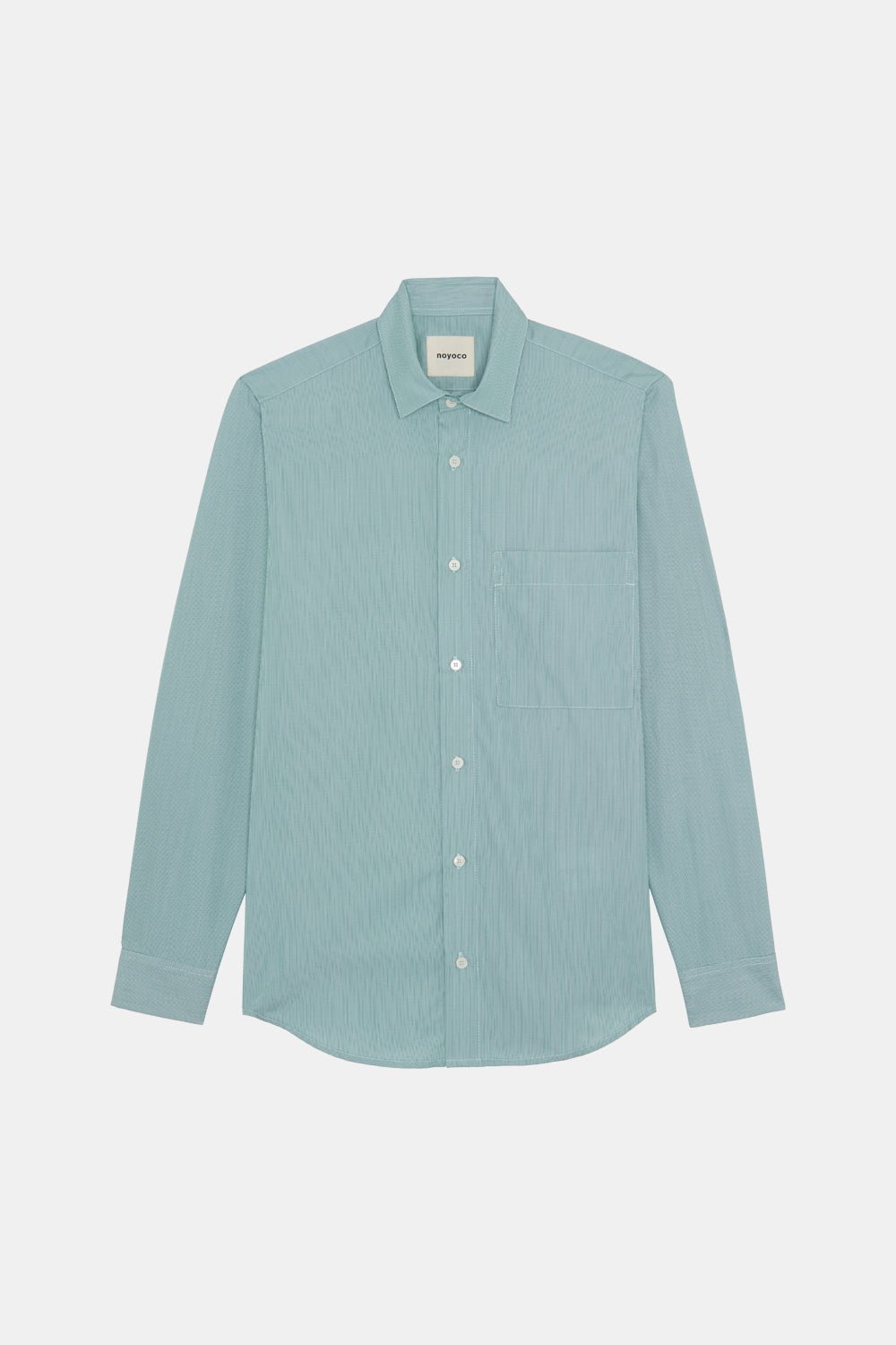 Camicia in cotone a maniche lunghe con sottili strisce verdi. Materiale riciclato, naturale e biodegradabile, tessuto nella Repubblica Ceca.