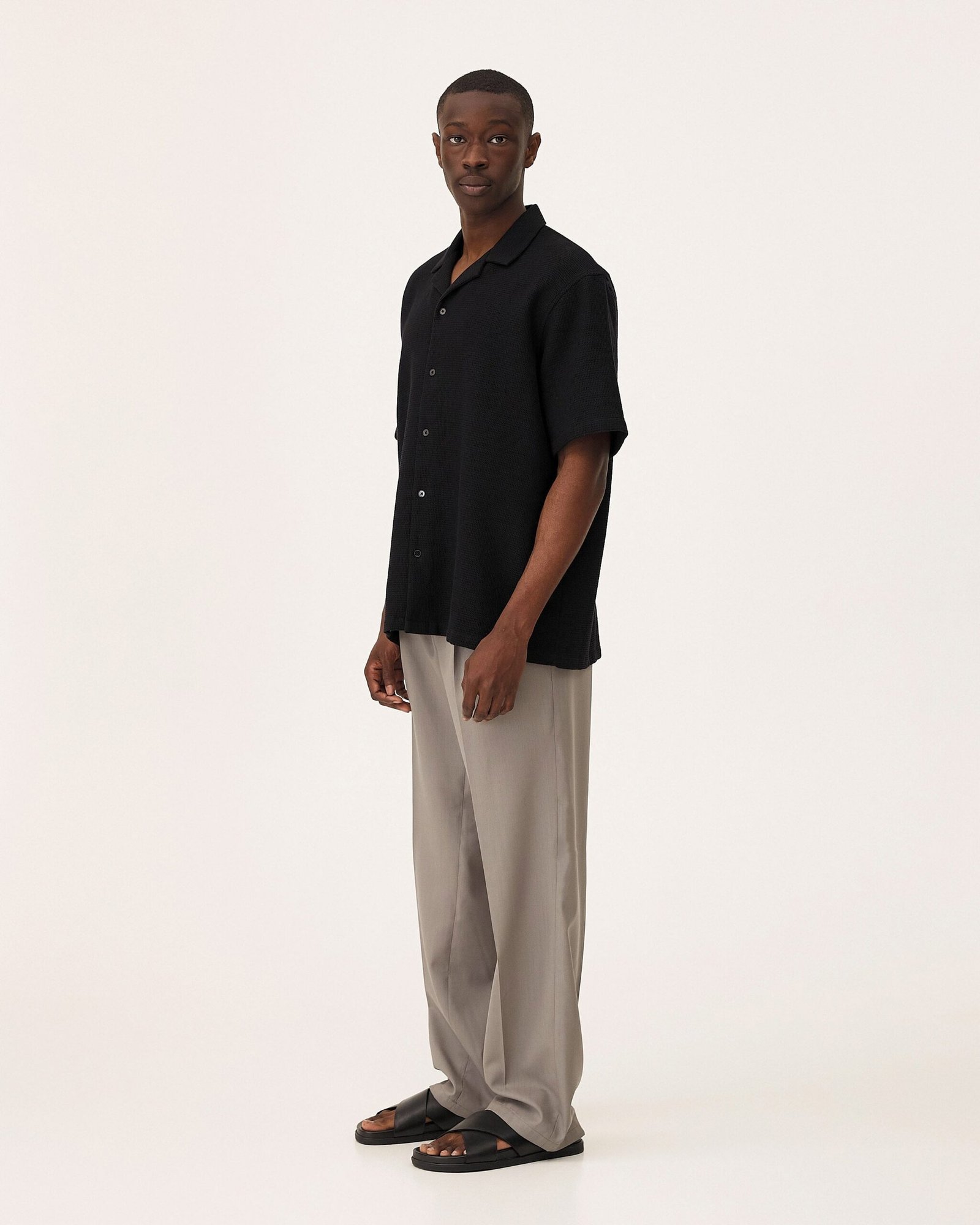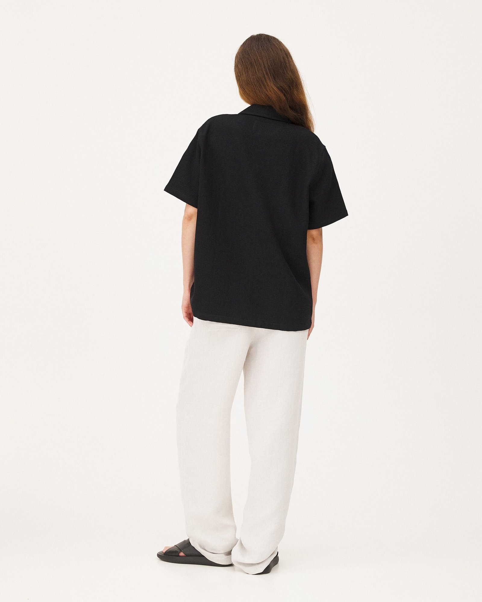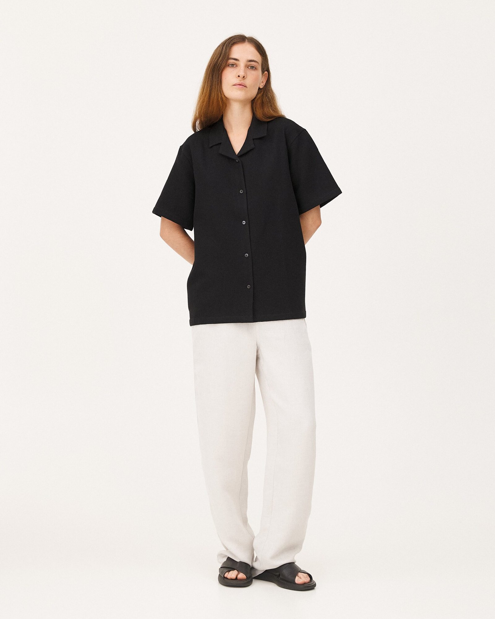 La nostra camicia Orleans è ispirata alle camicie hawaiane degli anni ’50. Uno stile estivo con vestibilità ampia e collo a palloncino. È realizzata in cotone organico goffrato tessuto in Portogallo.