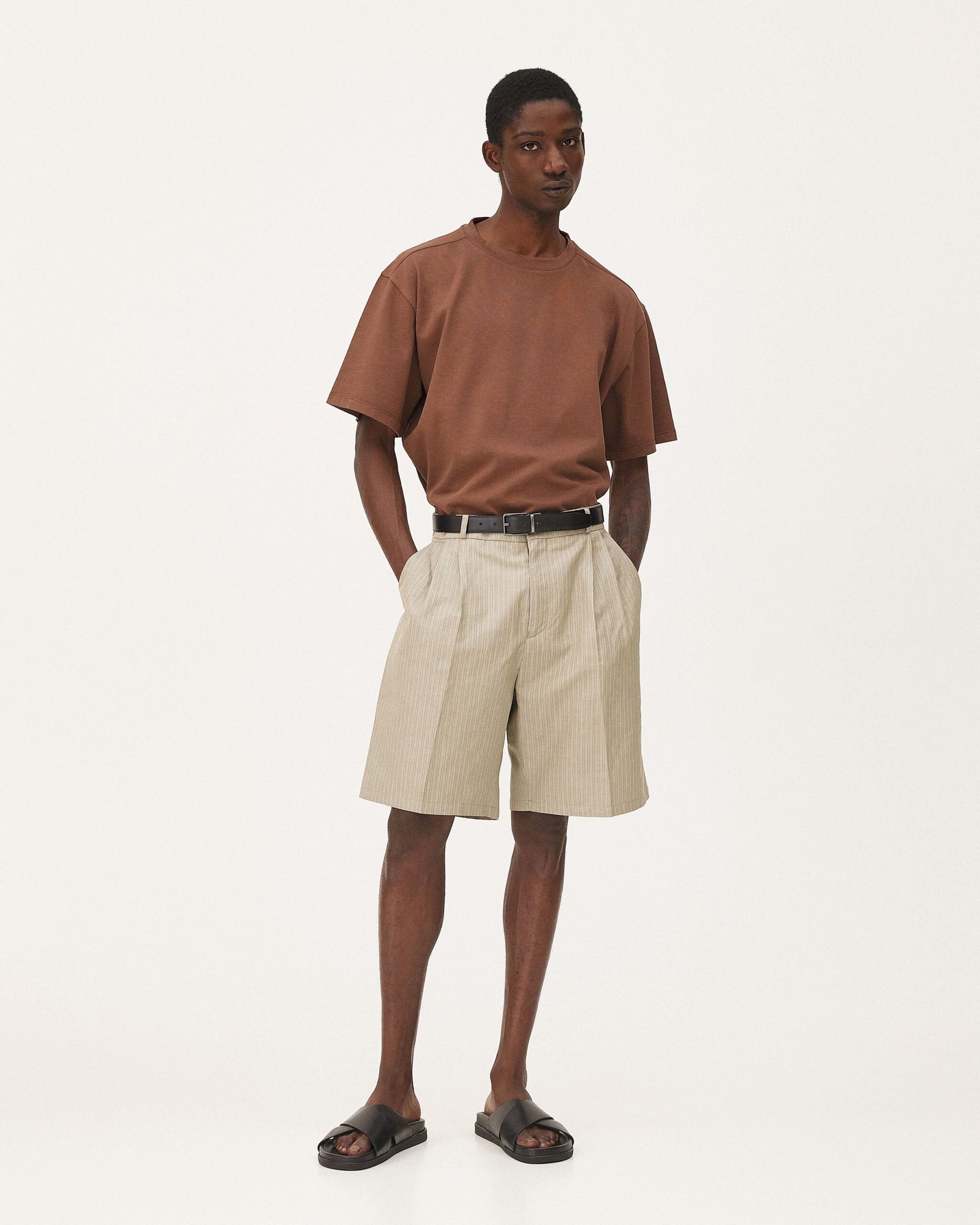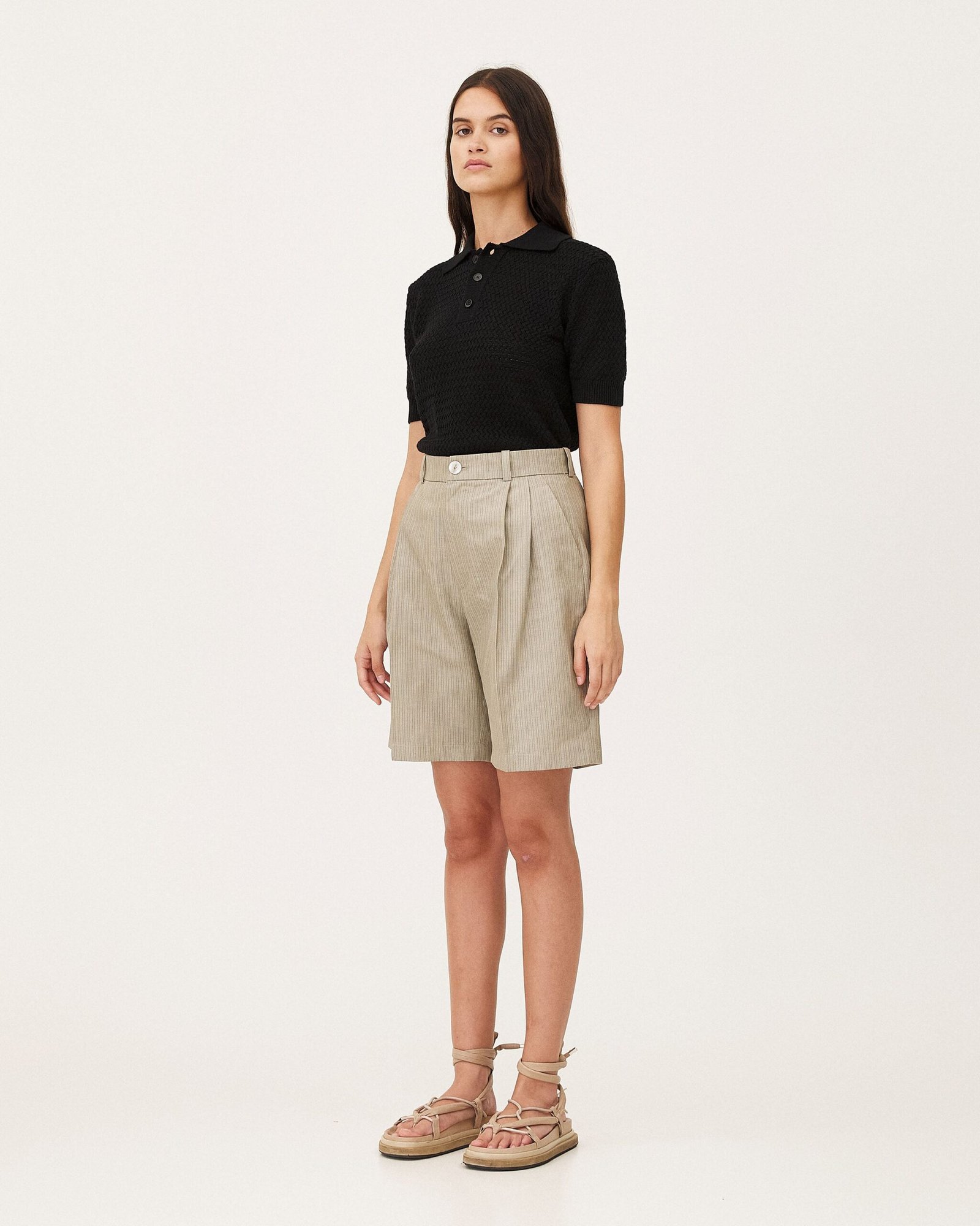 I pantaloncini Como prendono in prestito questi dettagli dal guardaroba degli abiti. Presentano due pinces anteriori, tasche italiane e tasche a filetto con bottone sul retro. Sono realizzati in un tessuto di cotone riciclato.