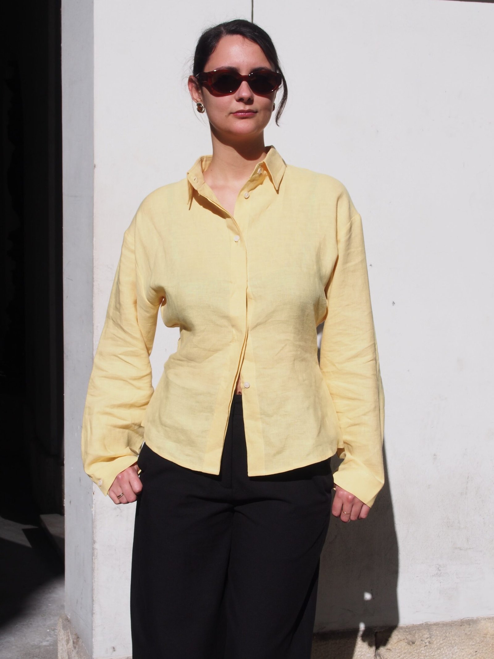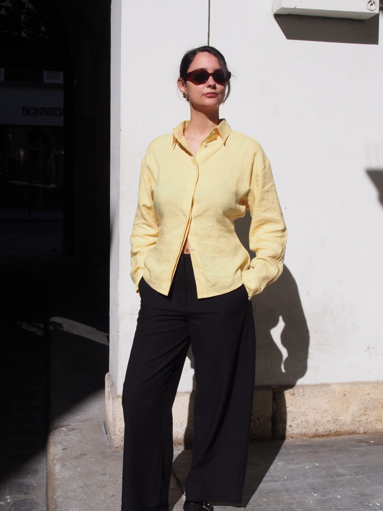 La nostra camicia Huut ha un taglio elegante ed è aderente in vita. È realizzata in lino coltivato in Francia e tessuto in Belgio.
