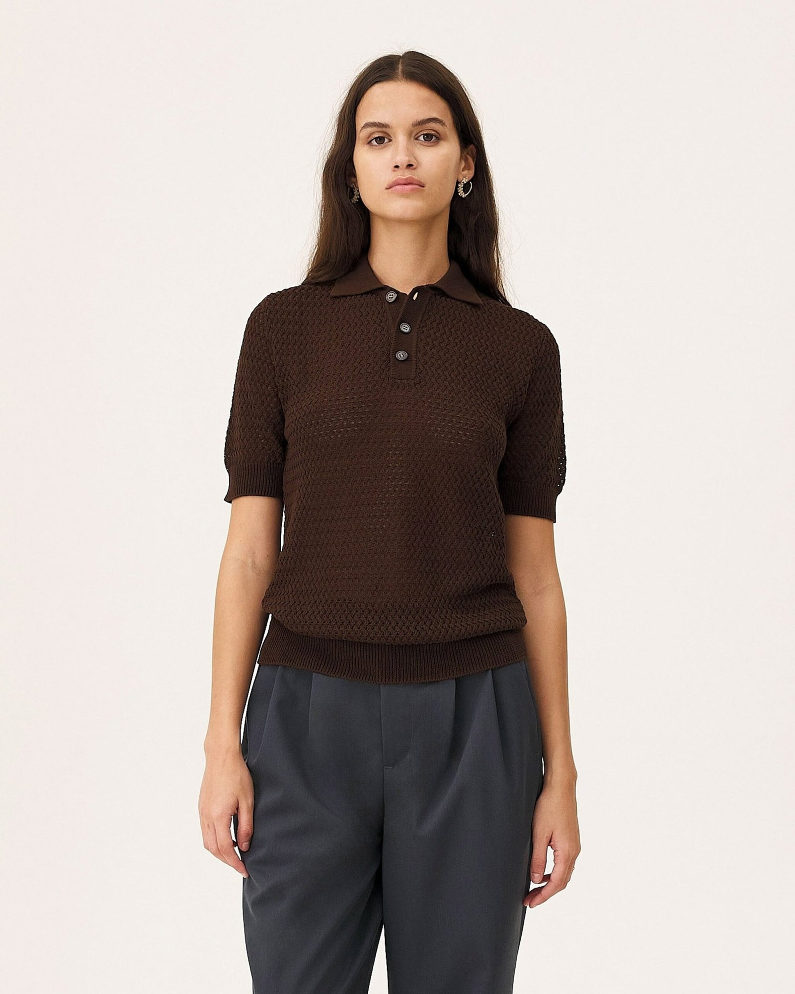 La polo Haring è un capo classico per ogni guardaroba unisex. È lavorata a maglia in un filato fine e morbido di cotone biologico. Il capo è lavorato a maglia con un punto geometrico. Ha un taglio dritto, un’abbottonatura con bottoni e bordi a coste.