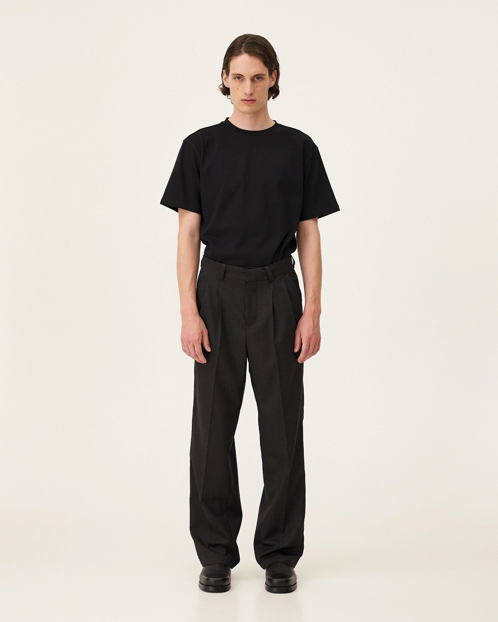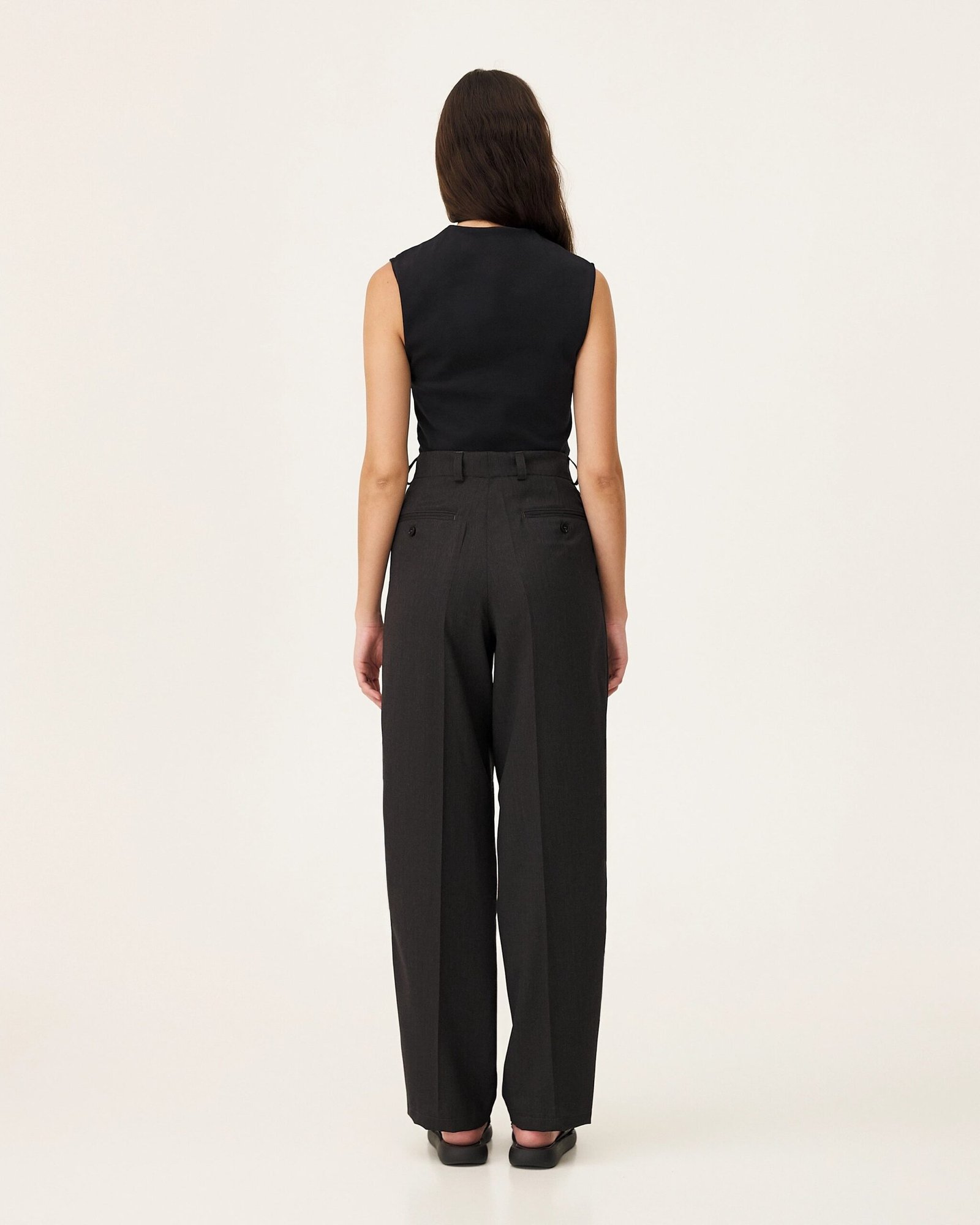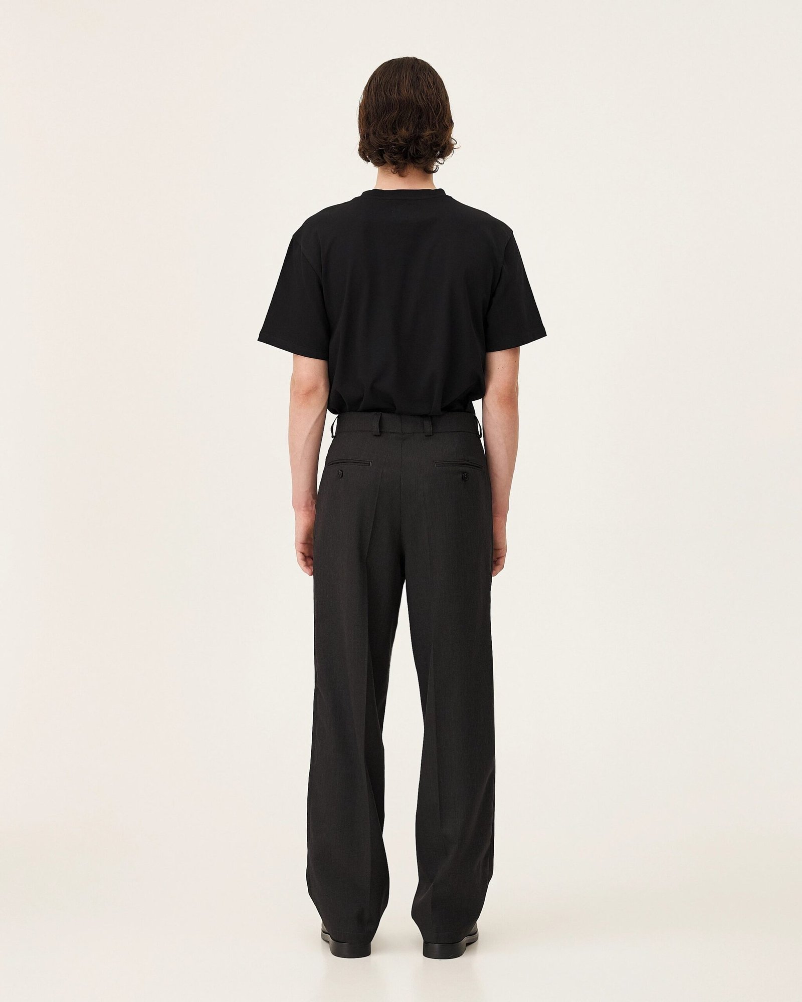 Questi pantaloni a gamba larga sono realizzati in un tessuto di lana tessuto in Portogallo. Presentano due pinces sul davanti, una delle quali scende lungo la gamba. I dettagli sartoriali e la vestibilità ampia creano una silhouette rilassata ed elegante.
