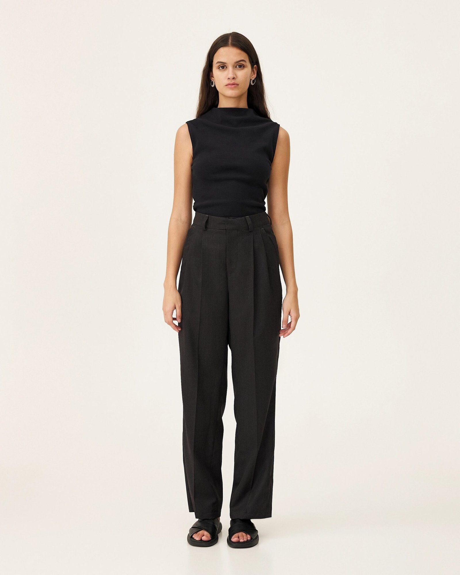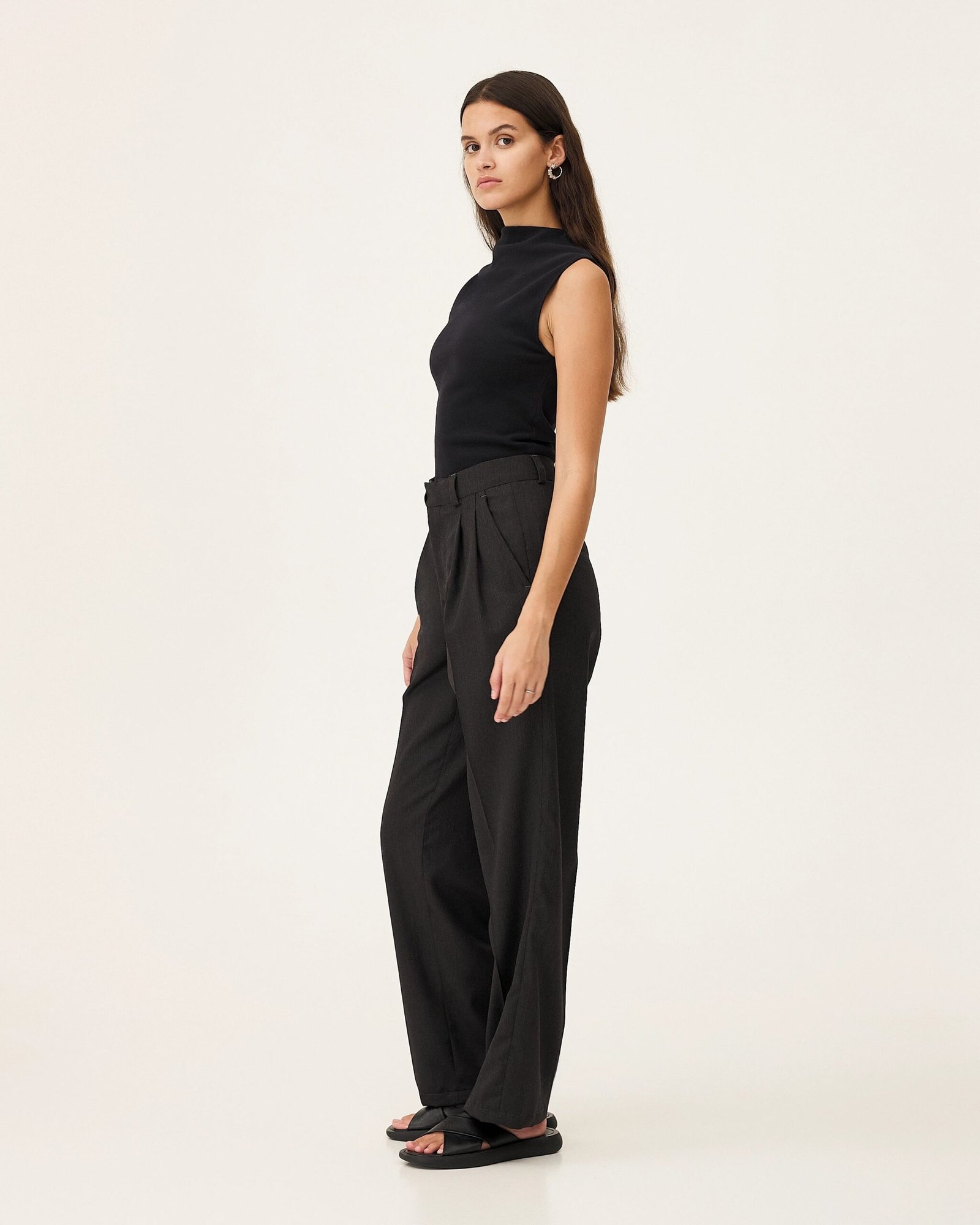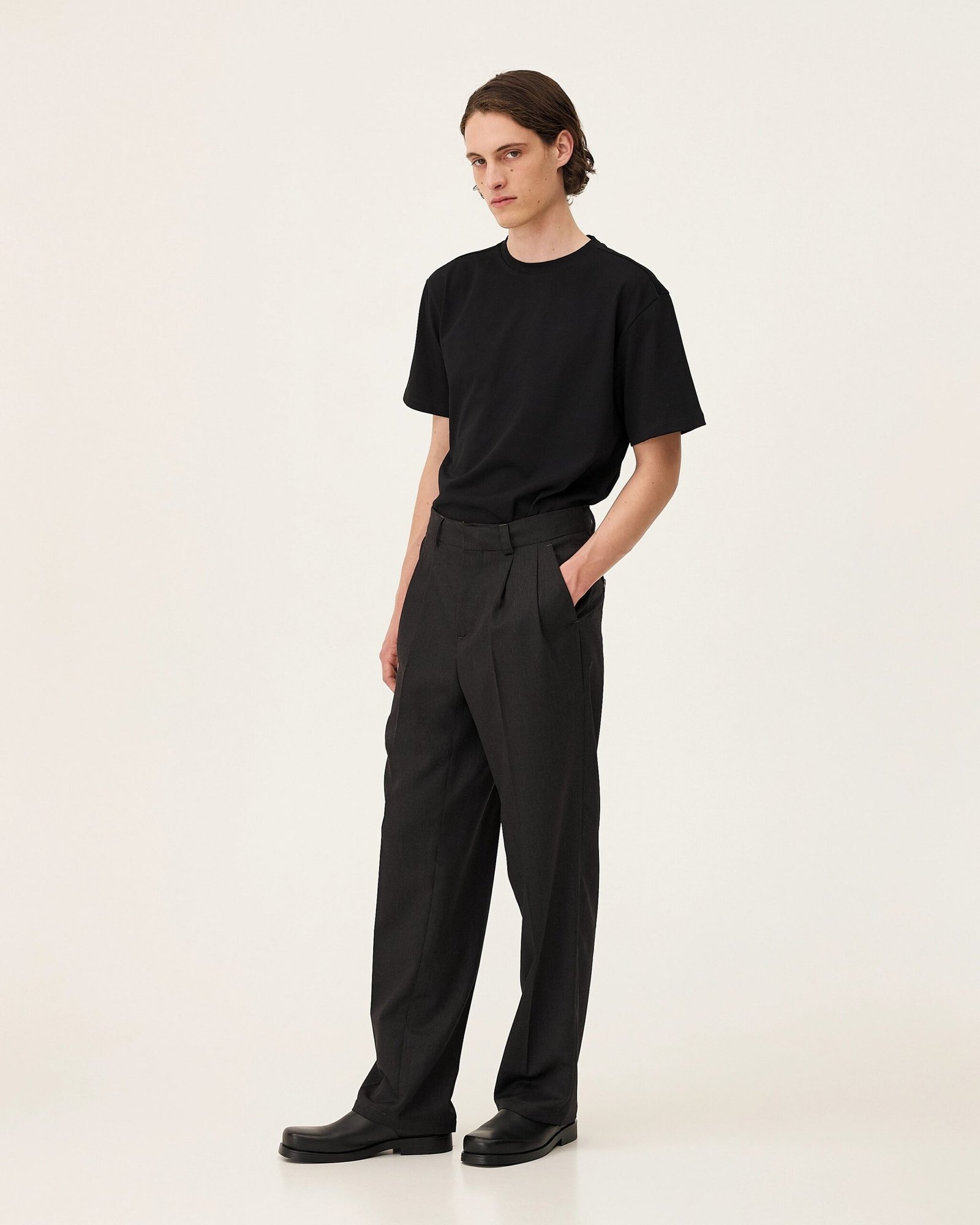 Questi pantaloni a gamba larga sono realizzati in un tessuto di lana tessuto in Portogallo. Presentano due pinces sul davanti, una delle quali scende lungo la gamba. I dettagli sartoriali e la vestibilità ampia creano una silhouette rilassata ed elegante.