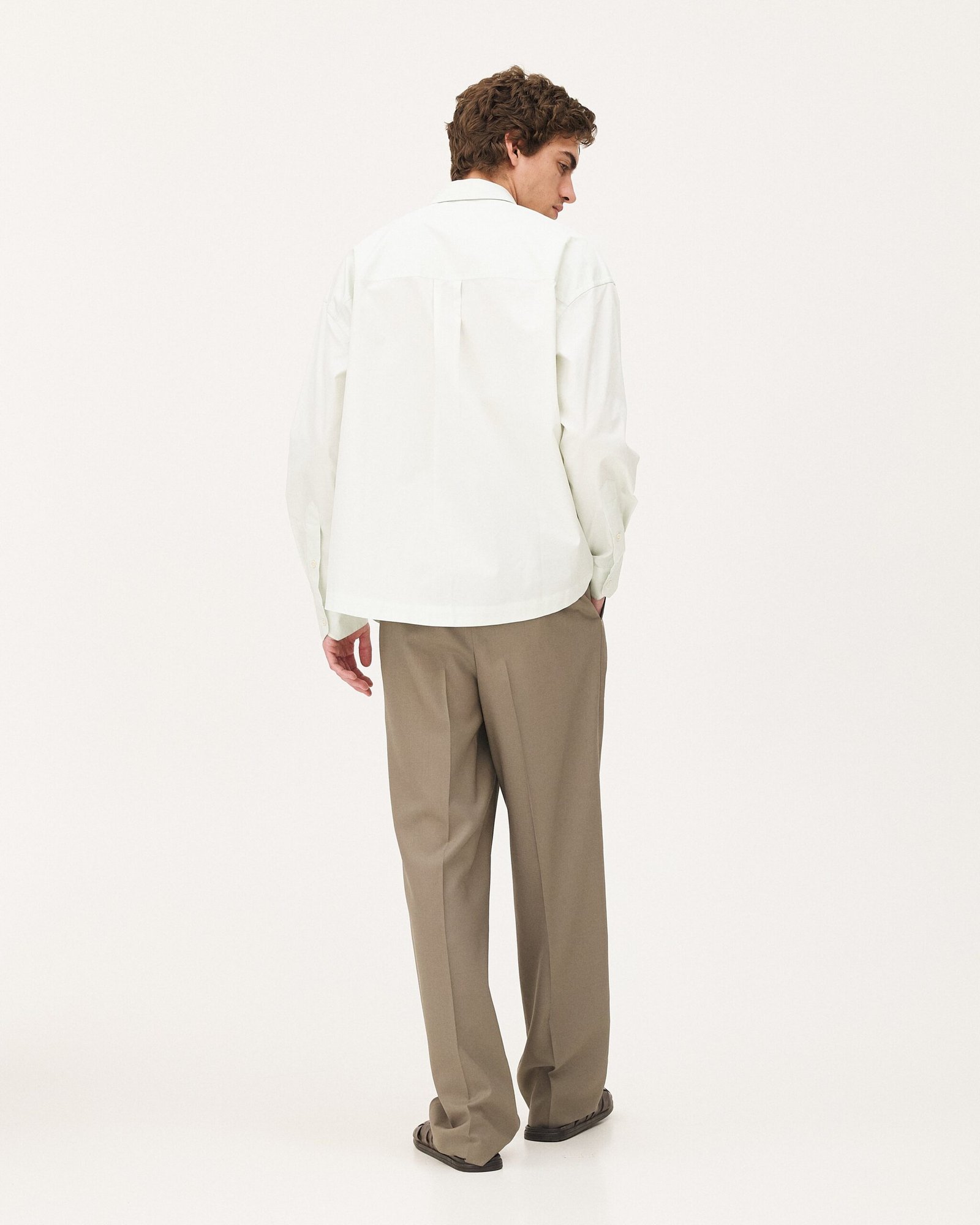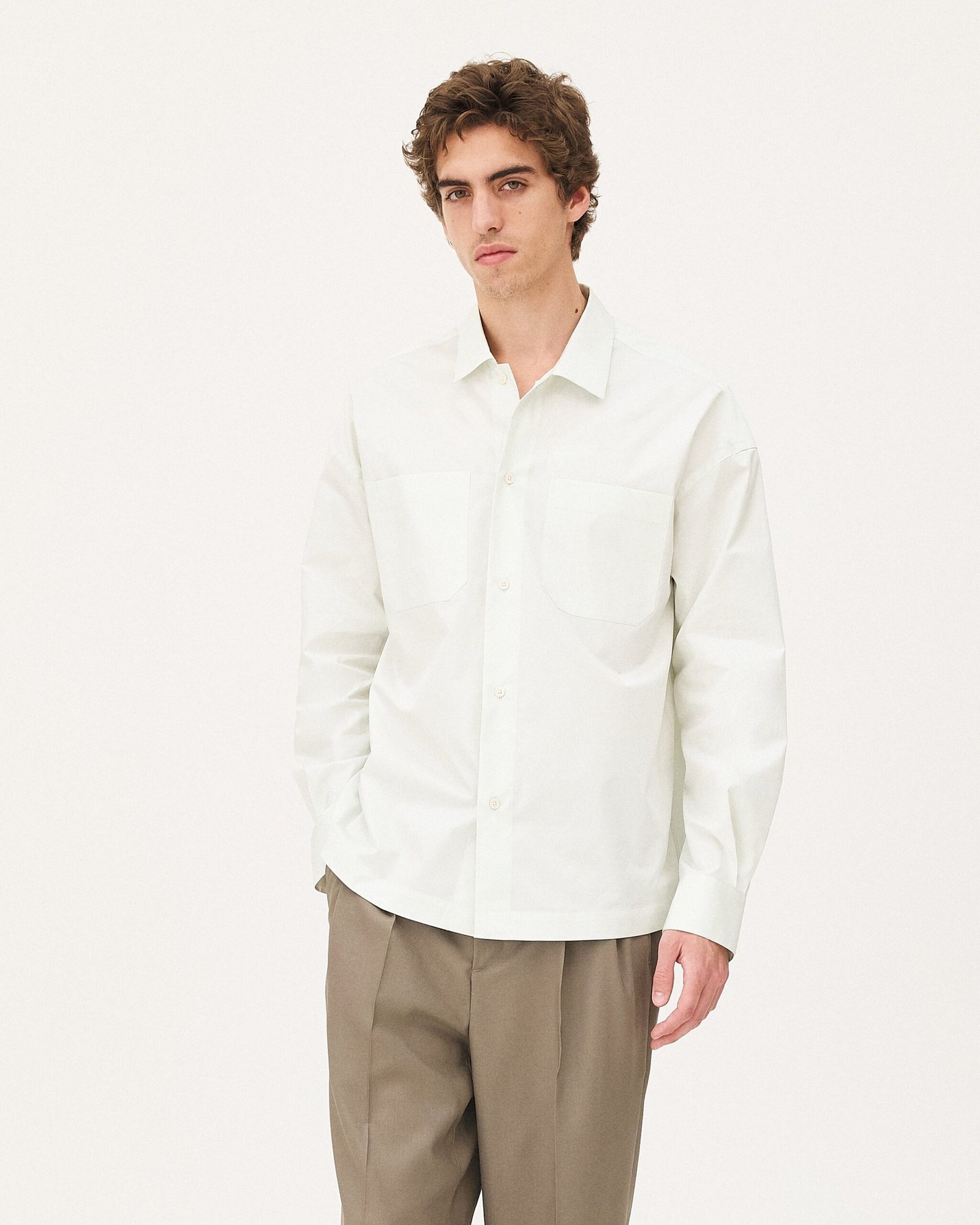 La camicia Bora è realizzata in popeline di cotone organico tessuto in Italia. Ha una vestibilità rilassata e sofisticata. La camicia presenta un colletto piatto, due tasche applicate e un orlo dritto di ispirazione rétro.