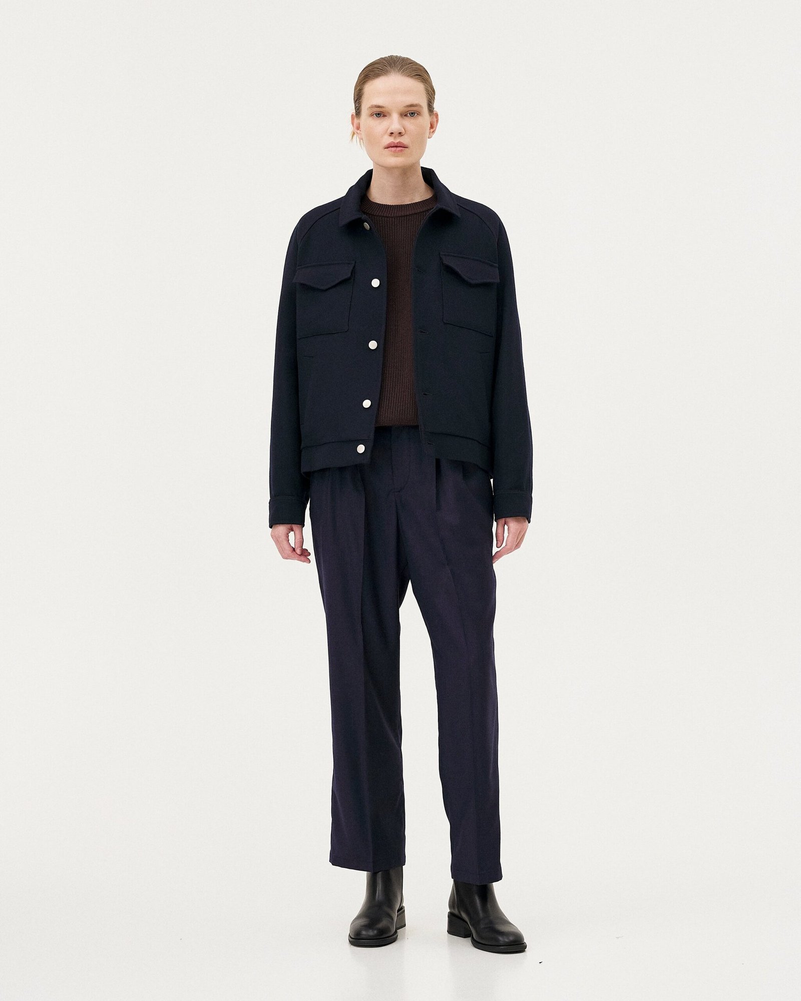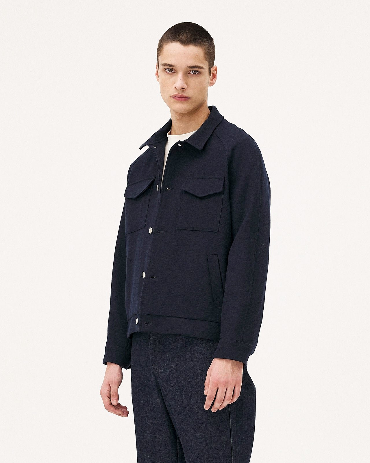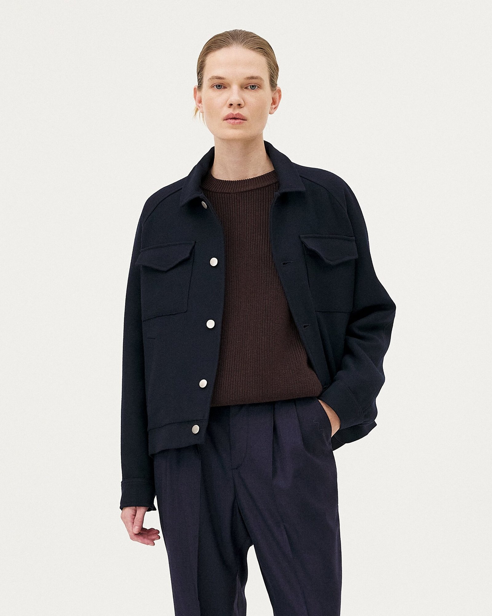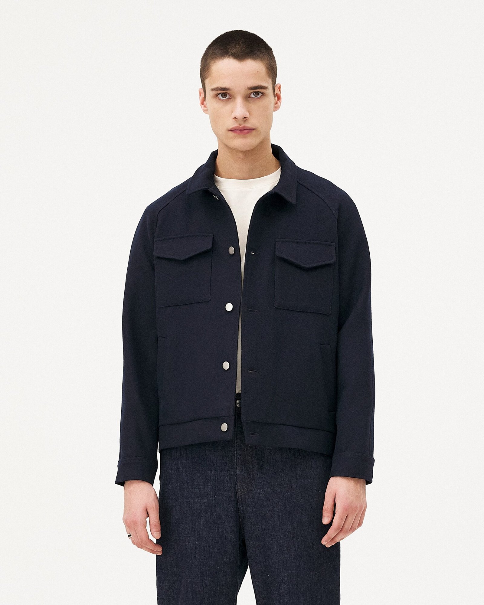 Uno dei pezzi iconici di Noyoco, la giacca Palma unisex è un perfetto equilibrio tra influenze workwear ed eleganza casual. È realizzata in twill di lana riciclata. Ha tasche applicate e tasche raglan. Le due pieghe sul retro conferiscono un aspetto leggermente a palloncino e facilità di movimento.