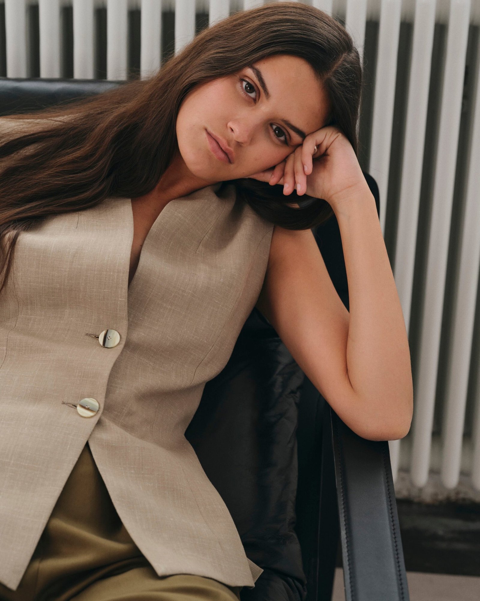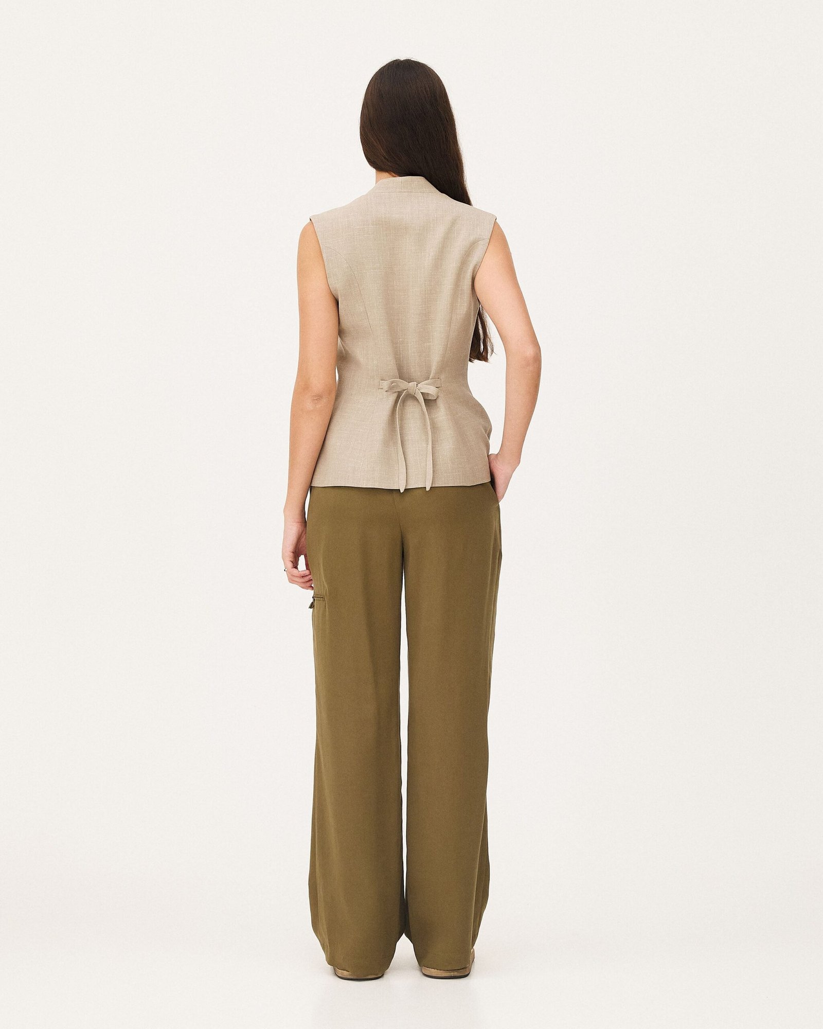 Il gilet Hegra è confezionato come un abito. Le pinces seguono le curve del corpo, conferendo struttura ed eleganza. È realizzato in un tessuto di lana e lino riciclato.