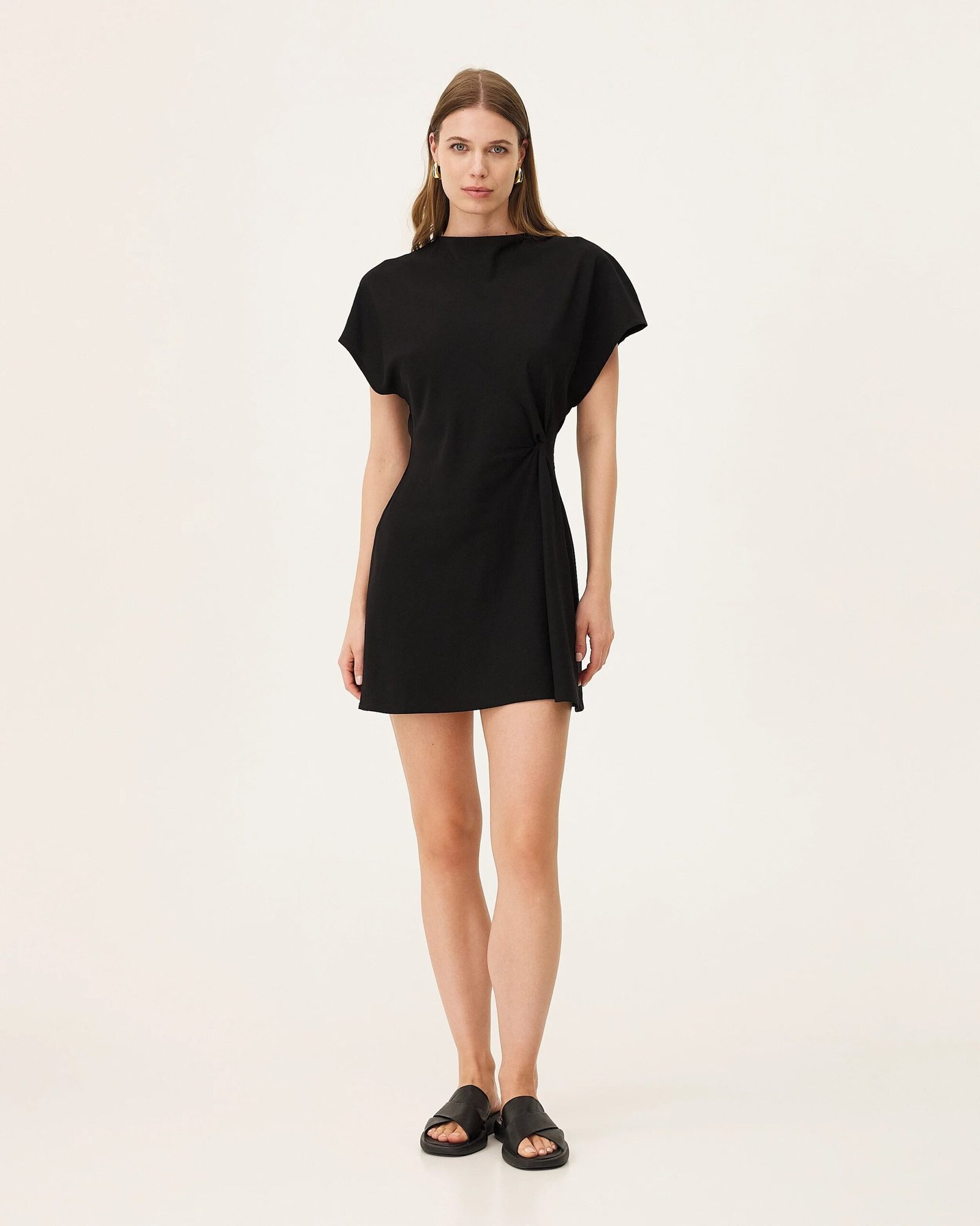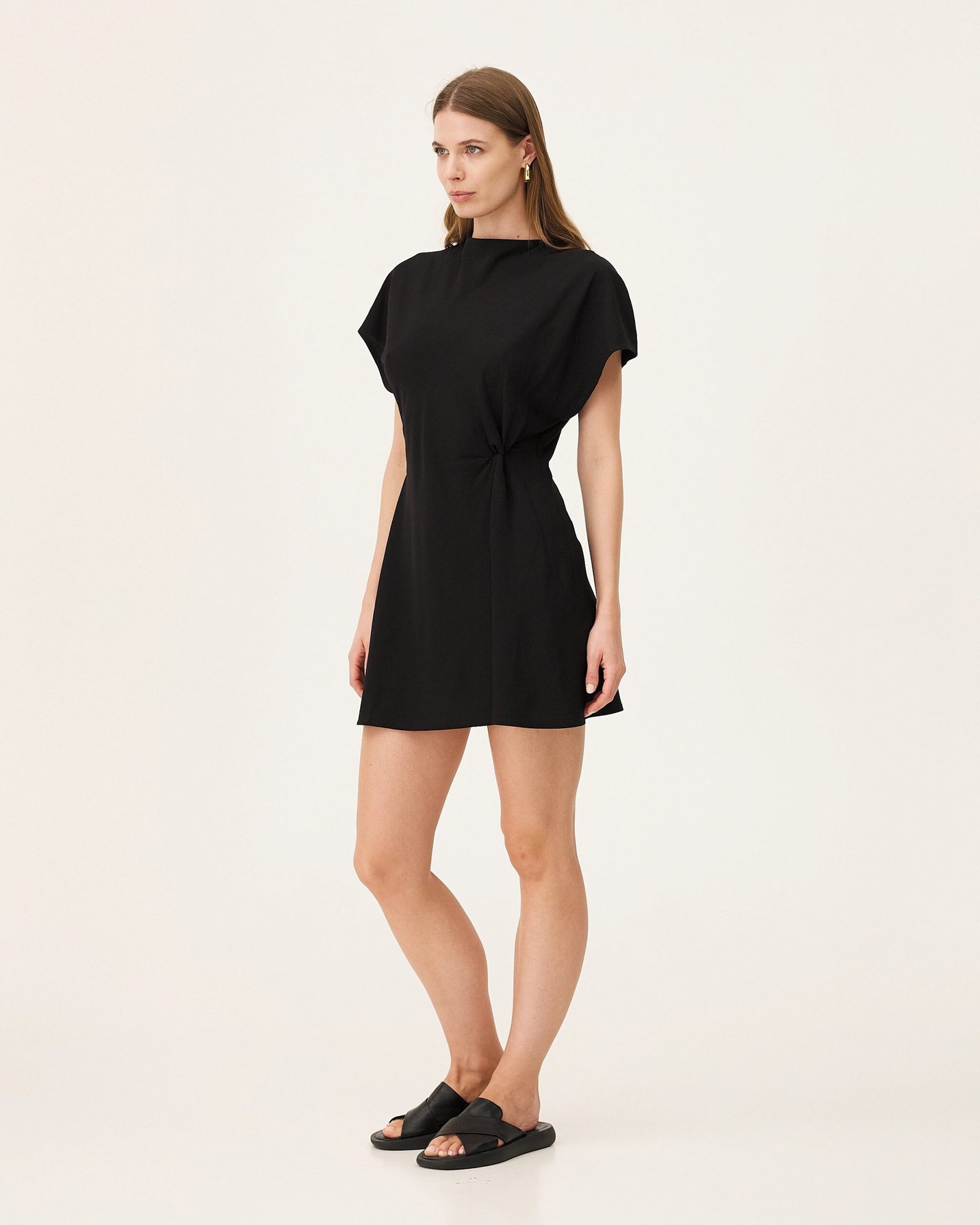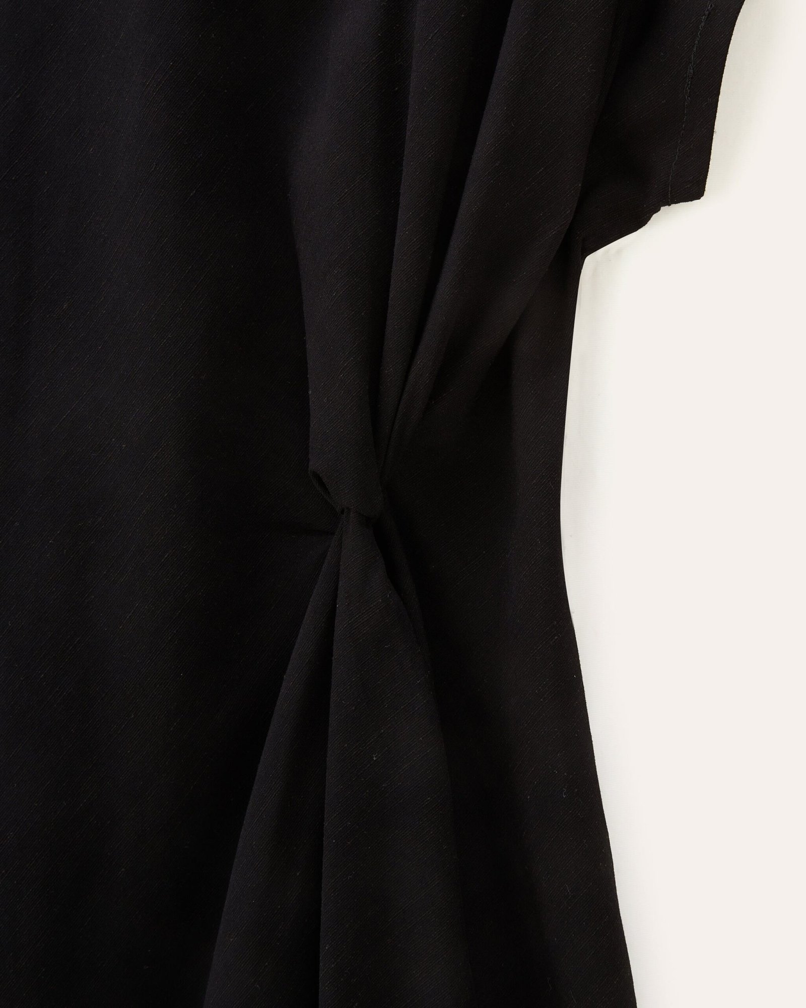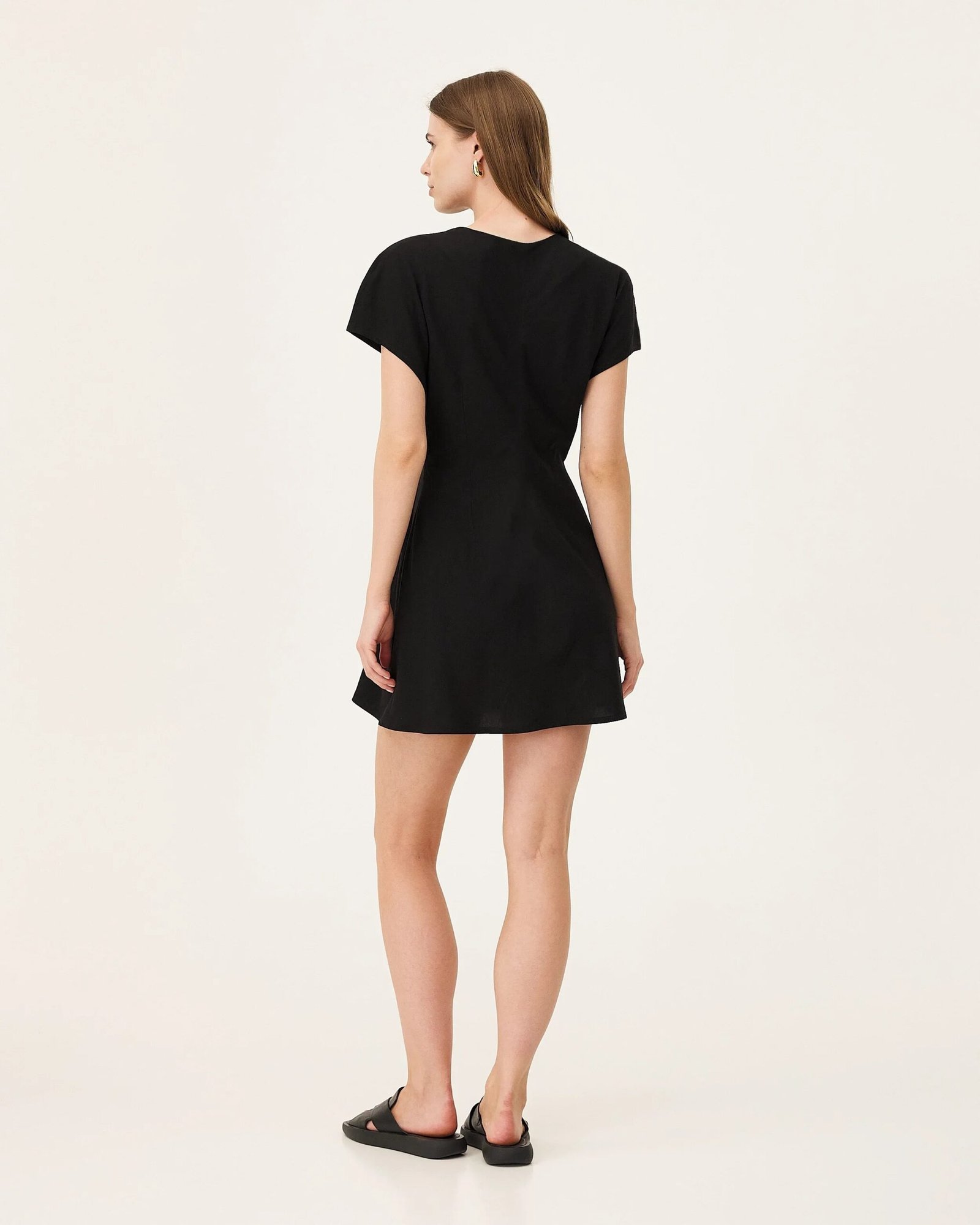 L’abito Sirara è realizzato in Tencel e lino, tessuti in Italia. L’abito è tagliato in sbieco, il che gli conferisce una naturale elasticità e morbidezza.