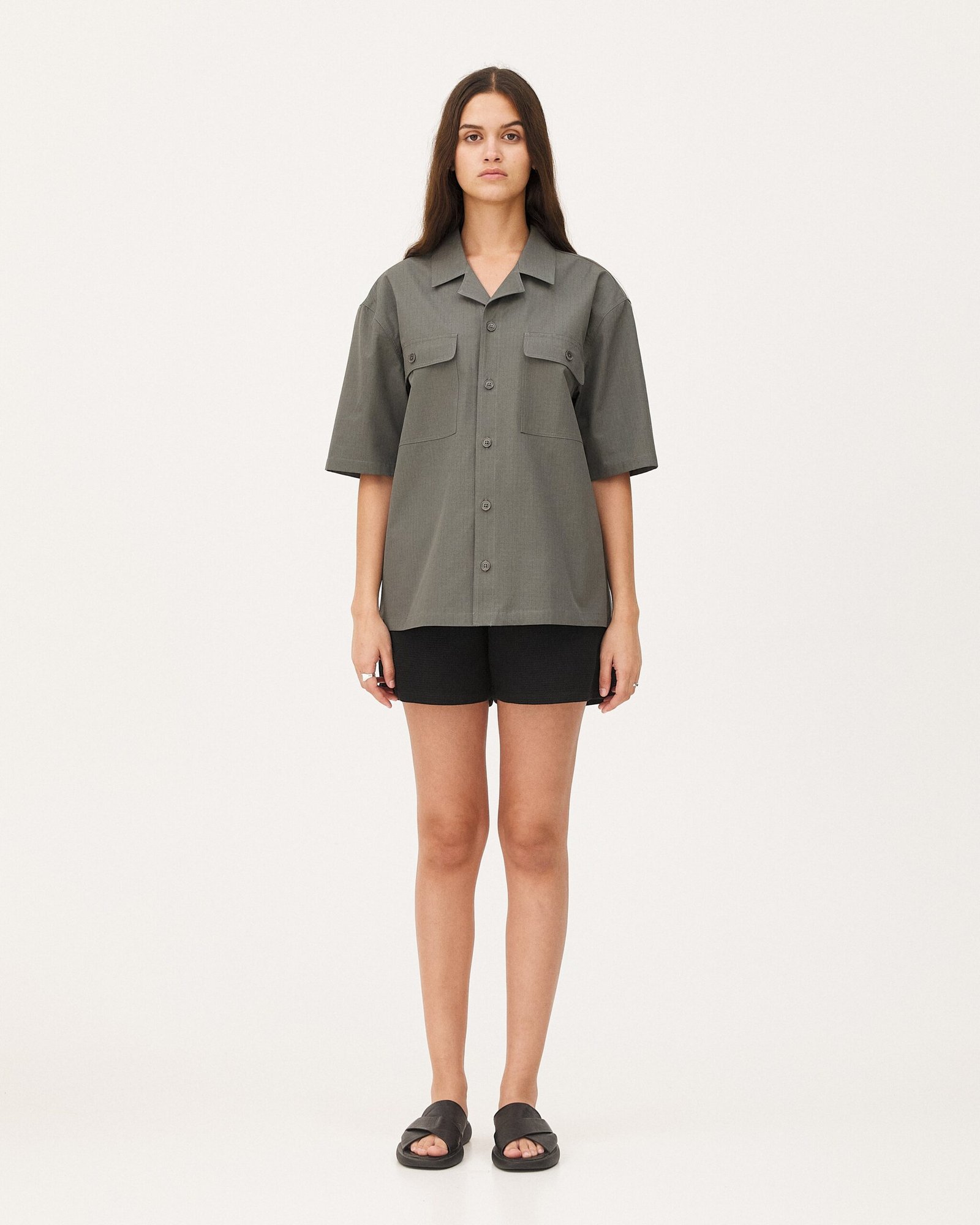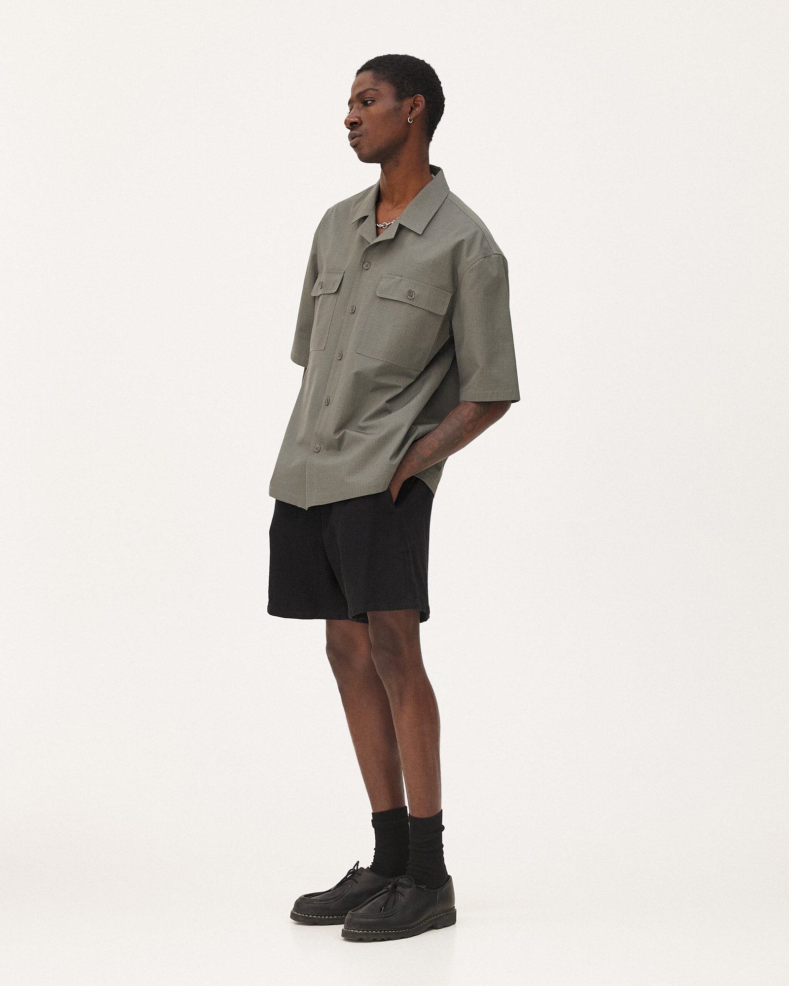 La camicia Borneo trae i suoi dettagli dal guardaroba utilitario dell’abbigliamento da lavoro. Ha una vestibilità ampia, un colletto a squalo, ampie tasche applicate con patta e un dettaglio per appendere gli occhiali. È realizzata in un tessuto di cotone organico con trama ripstop ultra resistente.