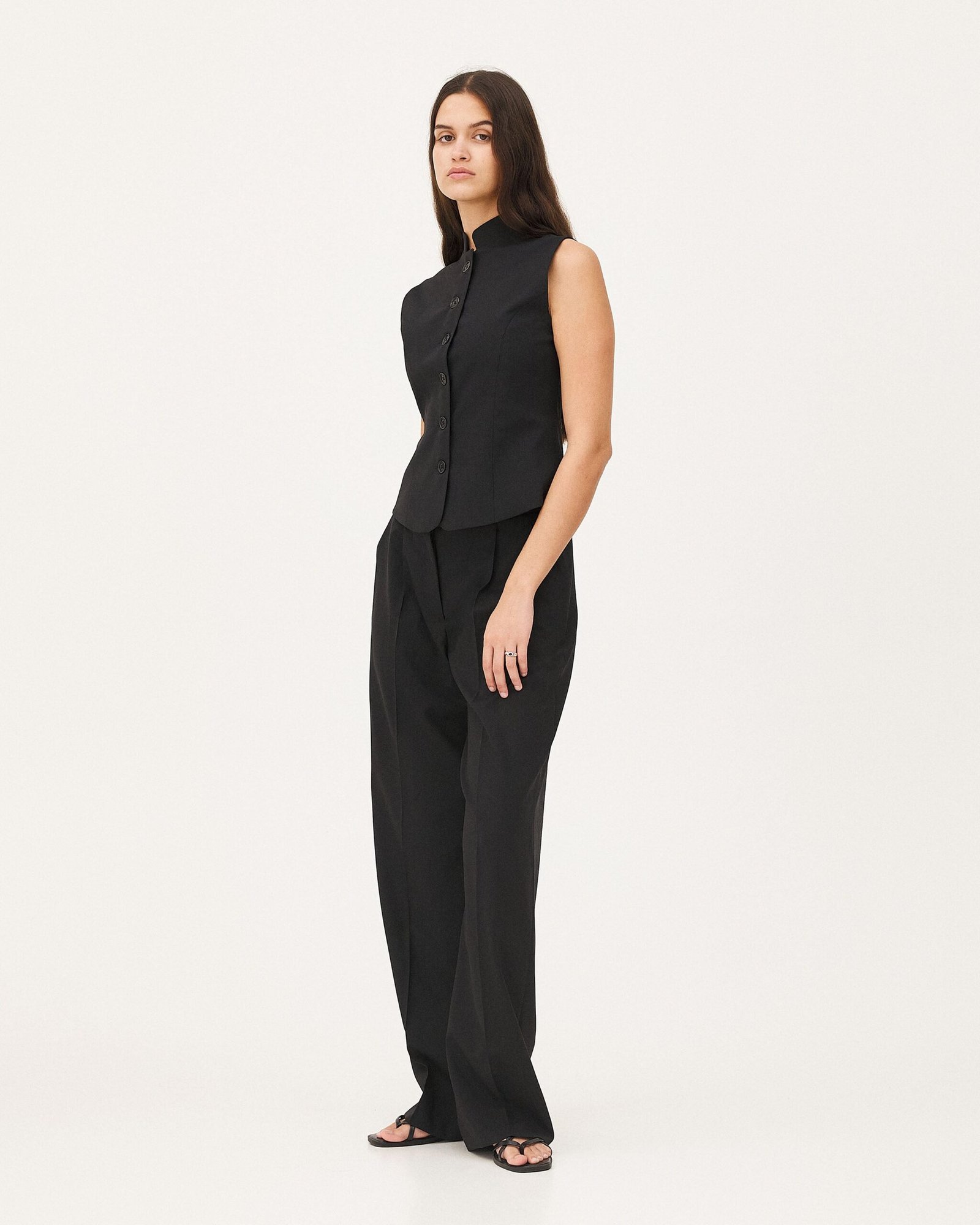 I pantaloni Vils sono una novità della stagione. Disegnati a vita bassa, presentano una marcata piega sul davanti di ogni gamba, che si estende fino al fondo. Questo modello rivisita i codici della sartoria classica, conferendo loro un’estetica moderna e minimalista. È realizzato in un tessuto di lana vergine riciclata.